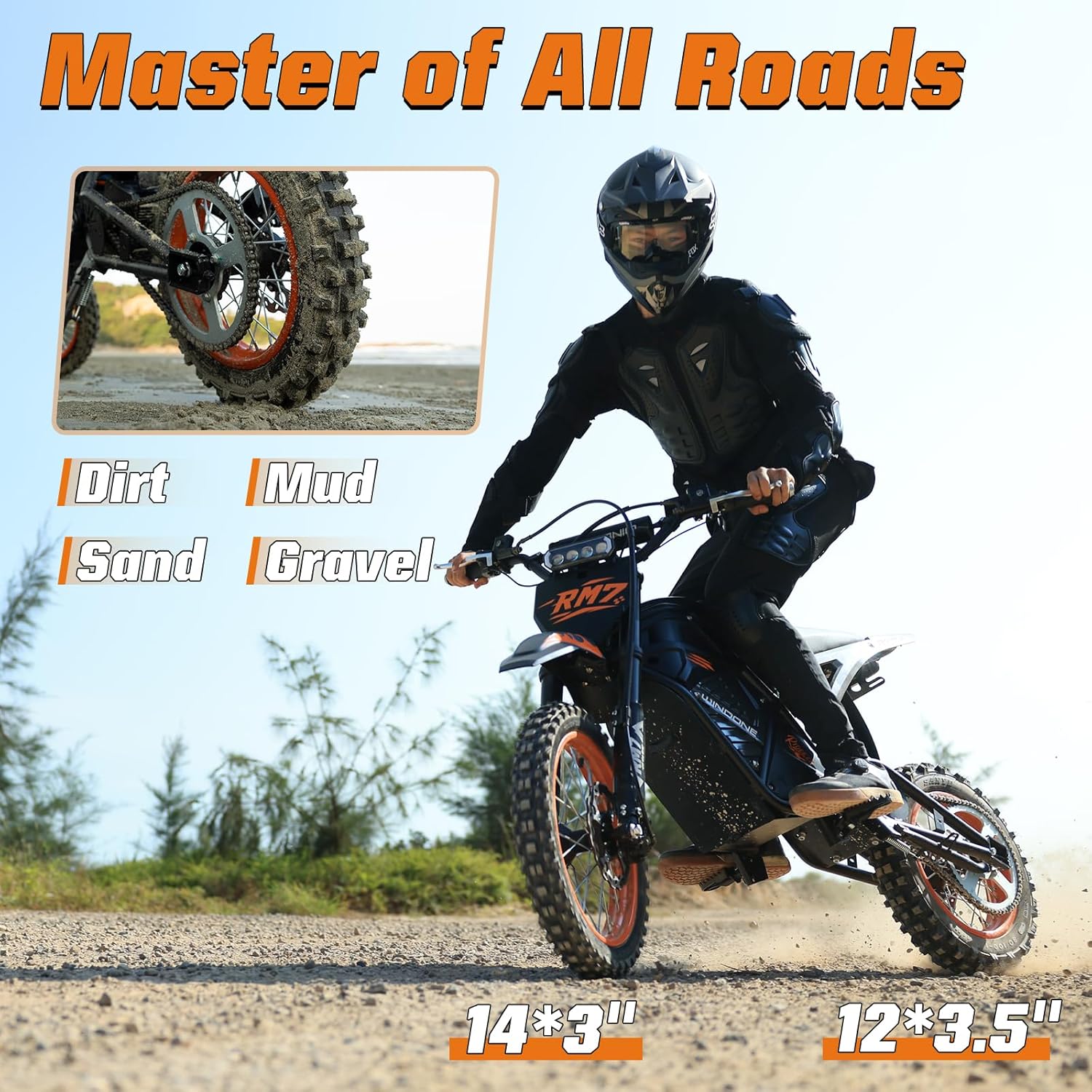【MOTOCROSS DESIGN & ULTIMATE COMFORT】 The RM7 electric dirt bike features an Inverted Hydraulic Front Fork (120mm travel) and a high-performance rear shock (35mm travel) for exceptional absorption. Paired with 14×2.7” front and 12×3.5” rear tires, this electric bike ensures maximum traction and stability on any terrain. With an IPX6 water resistance rating, this ebike is built to conquer mud and rain, delivering a true Motocross riding experience.