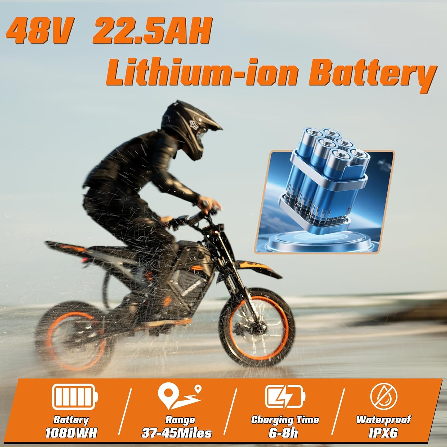 【EXTENDED RANGE BATTERY & UL CERTIFIED SAFETY】 Fuel your adventures on the RM7 electric dirt bike with a massive 48V 22.5Ah lithium battery, packing 1080Wh for 36-45 miles of continuous riding. Whether conquering trails or commuting on this electric bike, enjoy consistent power with a 6-8 hour recharge. This high-performance ebike allows you to ride with peace of mind. Passed UL 2849 certification and the testing laboratory is UL LLC.