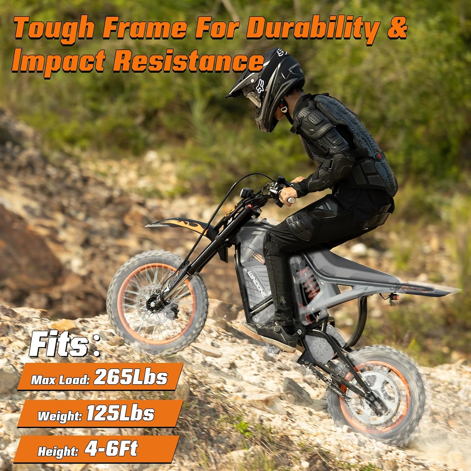 【VERSATILE FIT FOR TEENS & ADULTS】 Ideally sized (65”x30”x39”) for riders aged 13+, the RM7 electric dirt bike supports a max load of 265 lbs. Weighing 130 lbs, this electric bike accommodates heights from 4′ to 6′. It comes fully equipped with a digital dashboard, horn, turn signals, and bright lights, ensuring this ebike is safe for day or night riding.